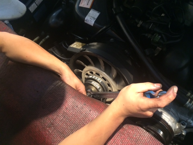 先日在庫車輌のファンベルトの警告等が点灯したため、交換の作業を行っております。