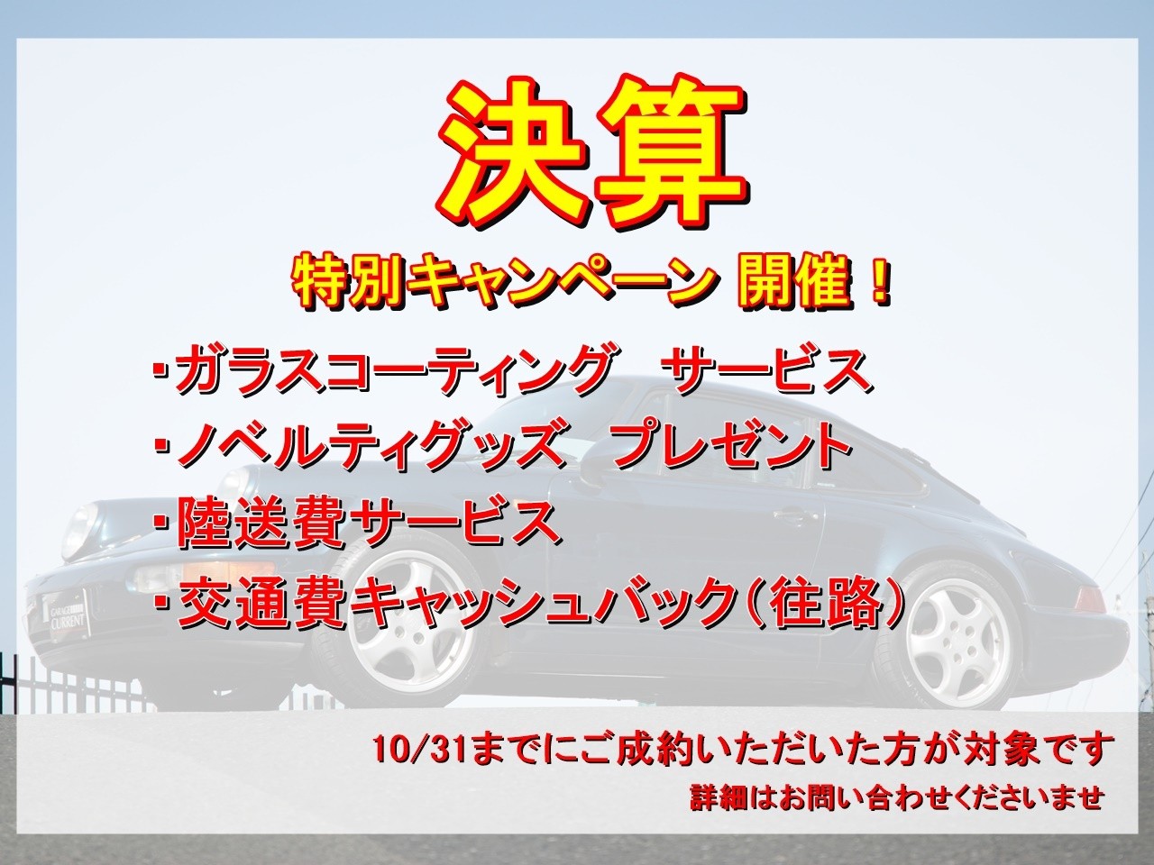 代車のご用意や積載車での引上げ、車検、定期点検、オイル交換、ワイパー交換、タイヤ交換、 鈑金、塗装、事故修理、エアロパーツ、マフラー製作、レザーカスタマイズ、RUFコンバージョンなどなど車に関することはガレージカレントと自社整備工場・カレントテックセンタにすべてお任せください!