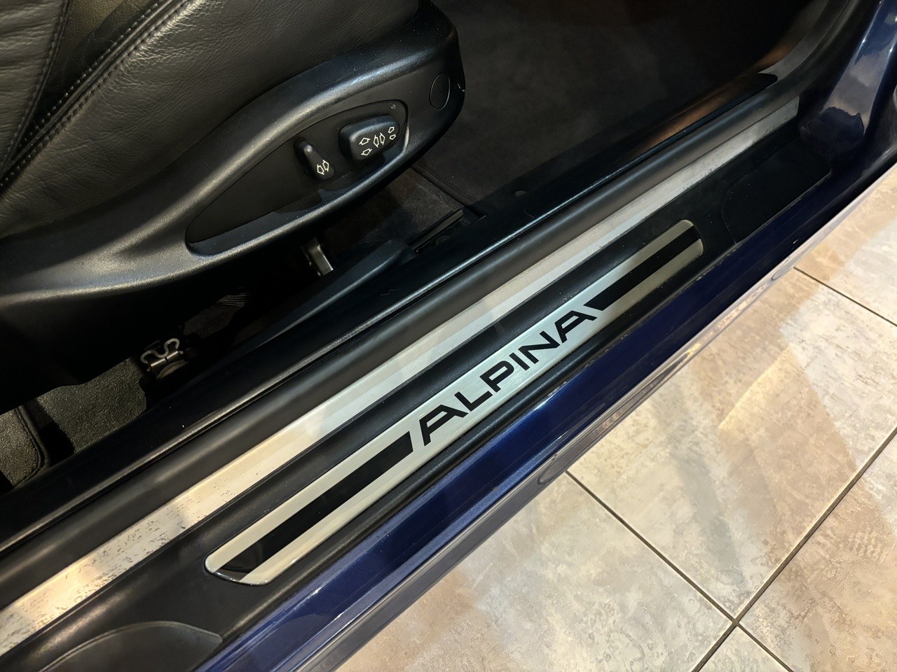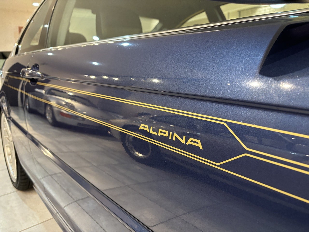 外装はALPINAを象徴するアルピナブルー。流麗なボディラインに、伝統のデコラインと20本スポークのClassicホイールが華を添えます。控えめながらも空力効果を計算されたフロント&トランクスポイラーが、このクルマが只者ではないことを静かに物語っています。