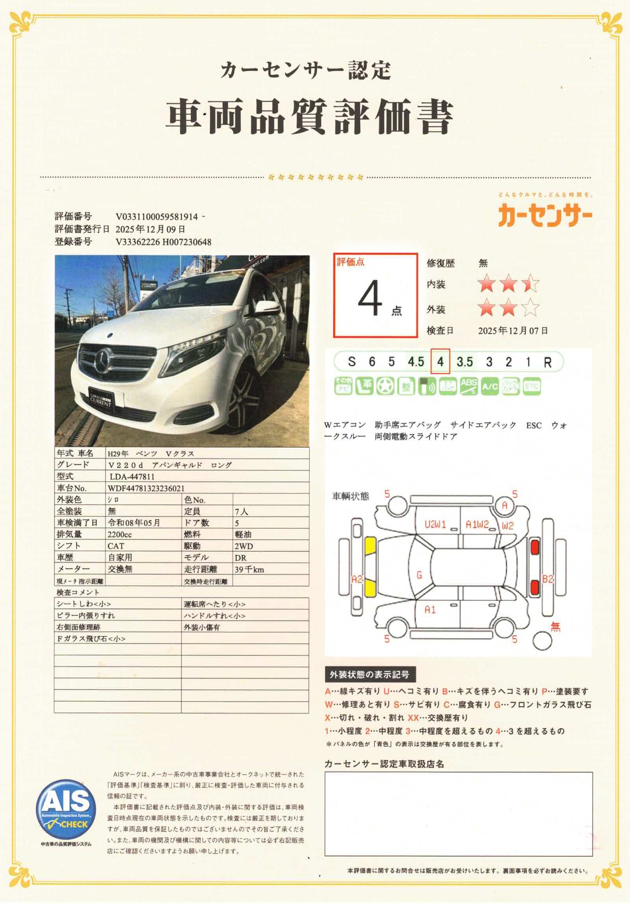 メルセデスベンツ Vクラス V220d アバンギャルド ロング 過去販売車輌 ディーラー車 スタッドレスタイヤ付き!