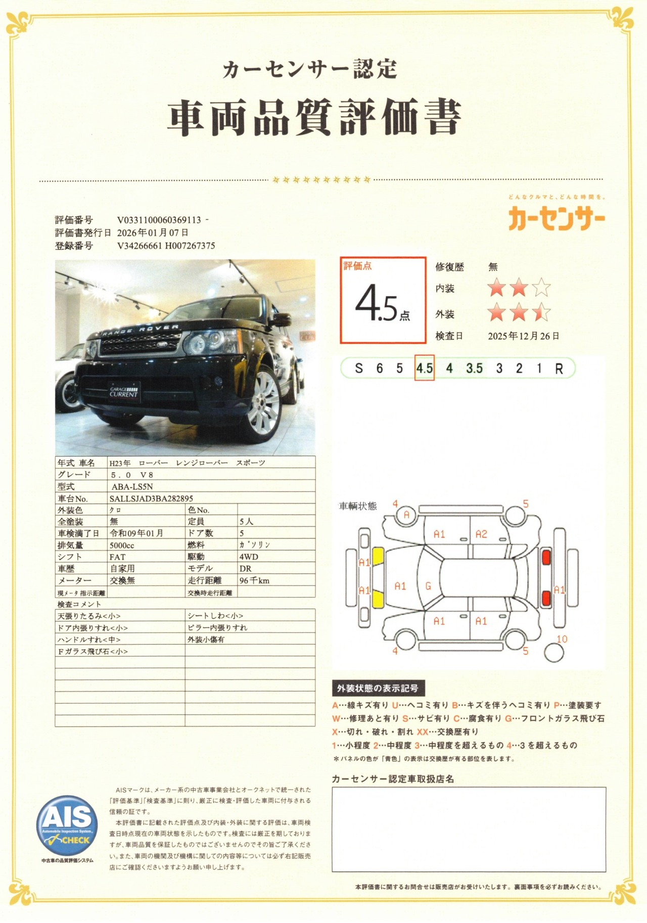 2011年 ランドローバー レンジローバースポーツ5.0 V8/ディーラー車/生産終了モデル/