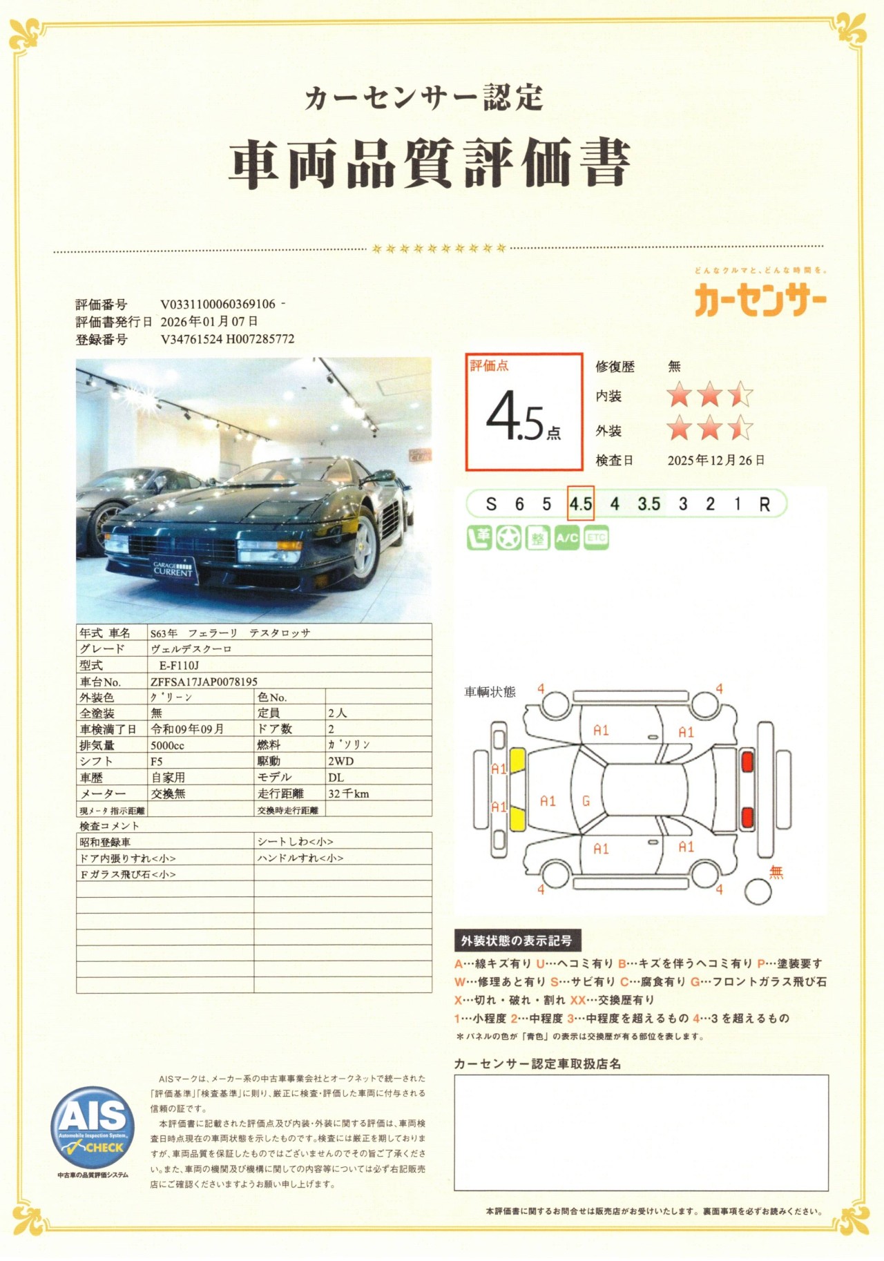 フェラーリ テスタロッサ 超希少色!ヴェルデスクーロ!オリジナルのグリーンカラー タンレザー 正規ディーラー車 ユーザー様直接買取車輌