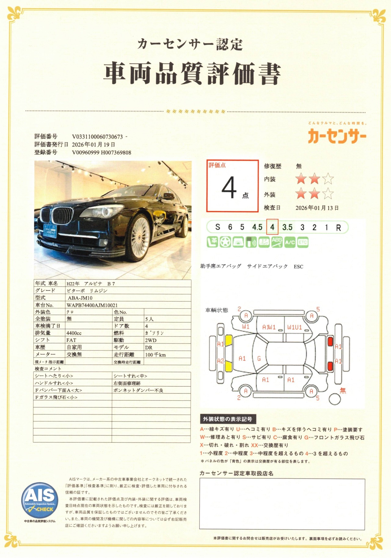 ※第三者機関「AIS」による検査実施にて評価済み (株式会社オートモビル・インスペクション・システム 車輌検査専門会社) http://www.ais-inc.jp/