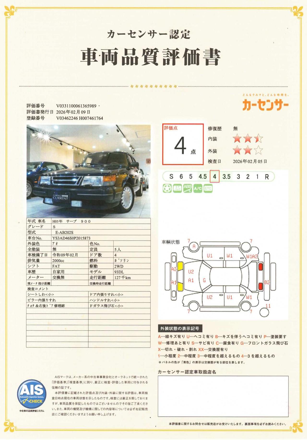 1993年 サーブ 900S セダン/ディーラー車(ミツワ物)/生産終了モデル/ユーザー様買取車輌/