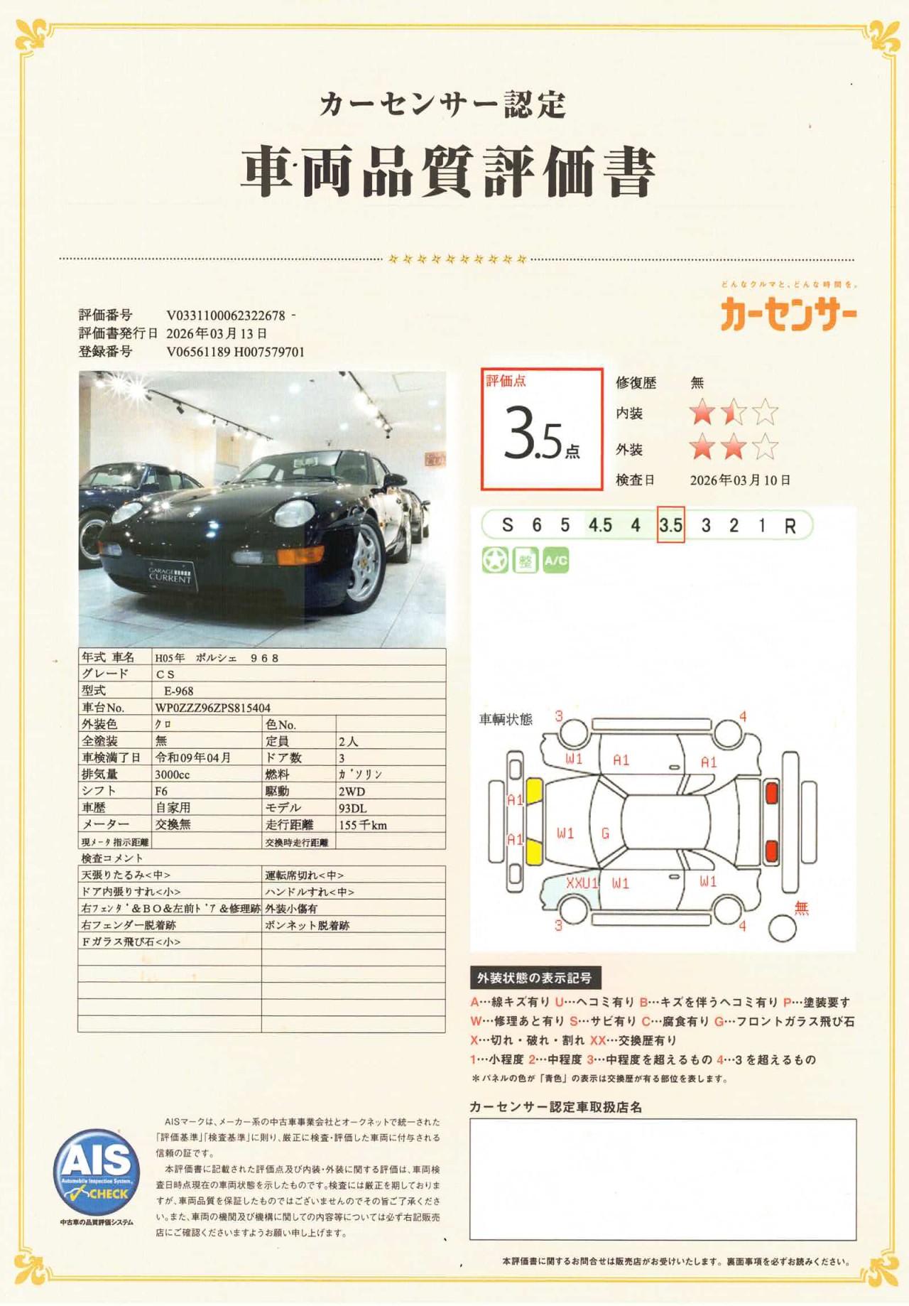 1993年 ポルシェ 968クラブスポーツ/ディーラー車/生産終了モデル/ユーザー様買取車輌/
