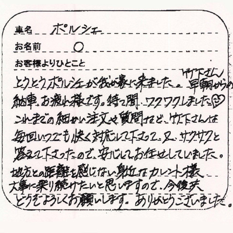 とうとうポルシェが我が家に来ました。竹下さん早朝からの納車、お疲れ様です。 待つ間、ワクワクしました。これまでの細かい注文や質問など、竹下さんは毎回いつでも快く対応して下さって、又、サクサクと答えて下さったので安心してお任せしていました。地方との距離を感じない、身近なカレント様、大事に乗り続けたいと思いますので、今後共どうぞよろしくお願いします。ありがとうございました。